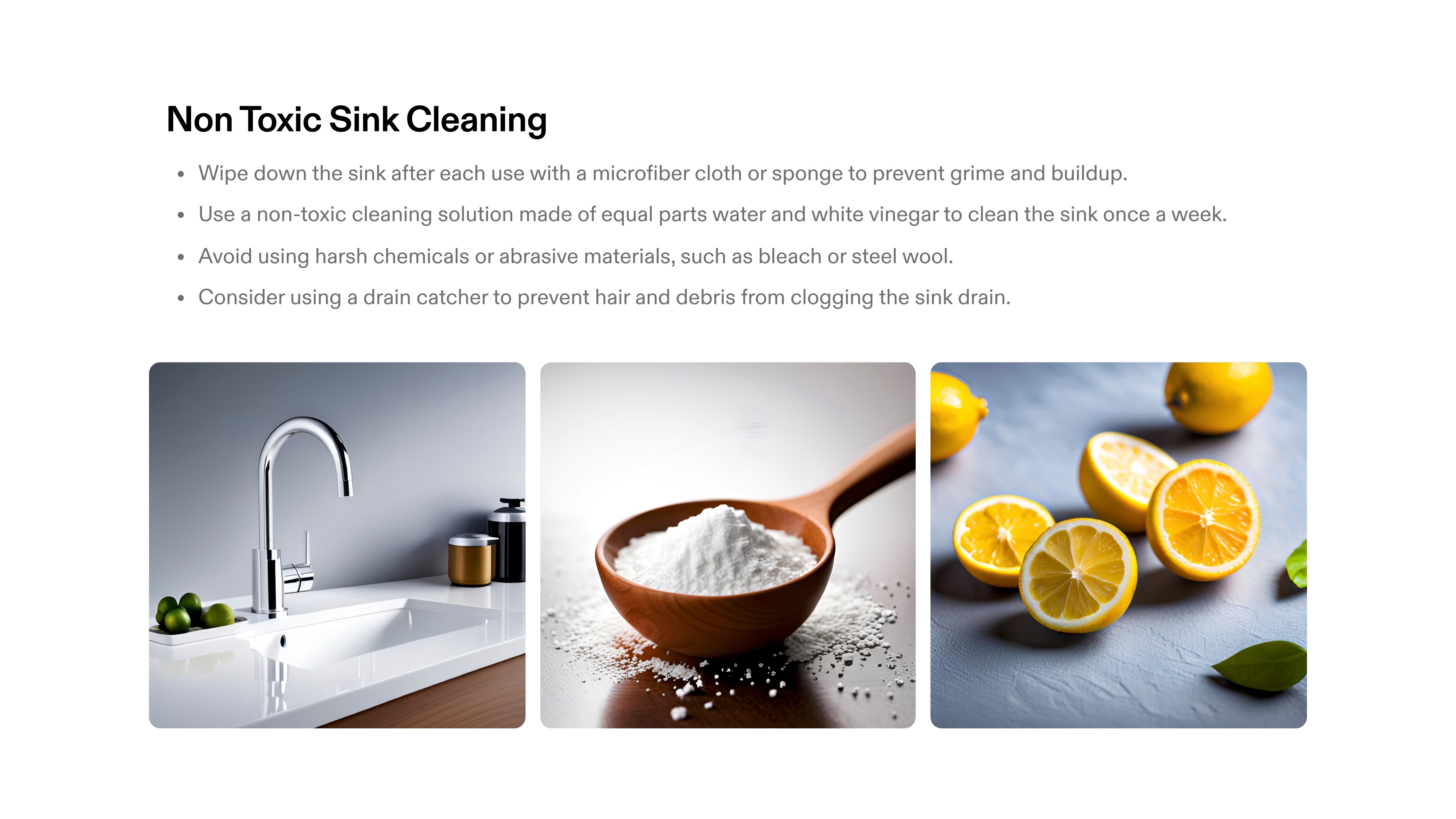 Boom. No need to know anything about scouring sinks without chemicals. Tome generated a how-to page with concise suggestions letting the images tell a deeper story. You can always change your mind—want more copy with step-by-steps and less imagery? You can right-click in the command bar to quickly undo actions and give it another spin.