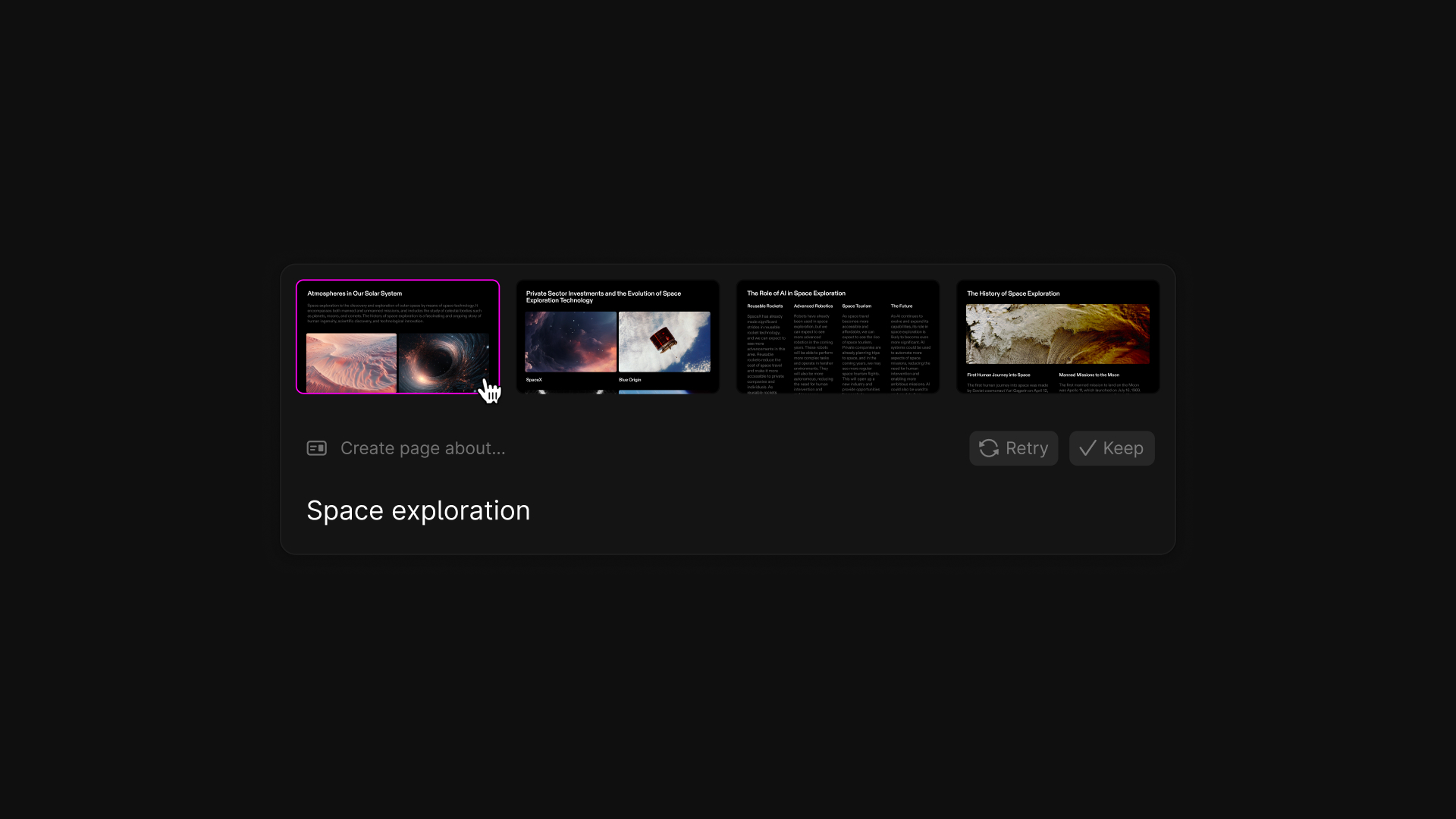 Using page generation lets you quickly explore ideas, experiment, and get messy. As you shape, iterate and refine your ideas from beginning to end, page generation can help kickstart new inspiration with a single prompt.
