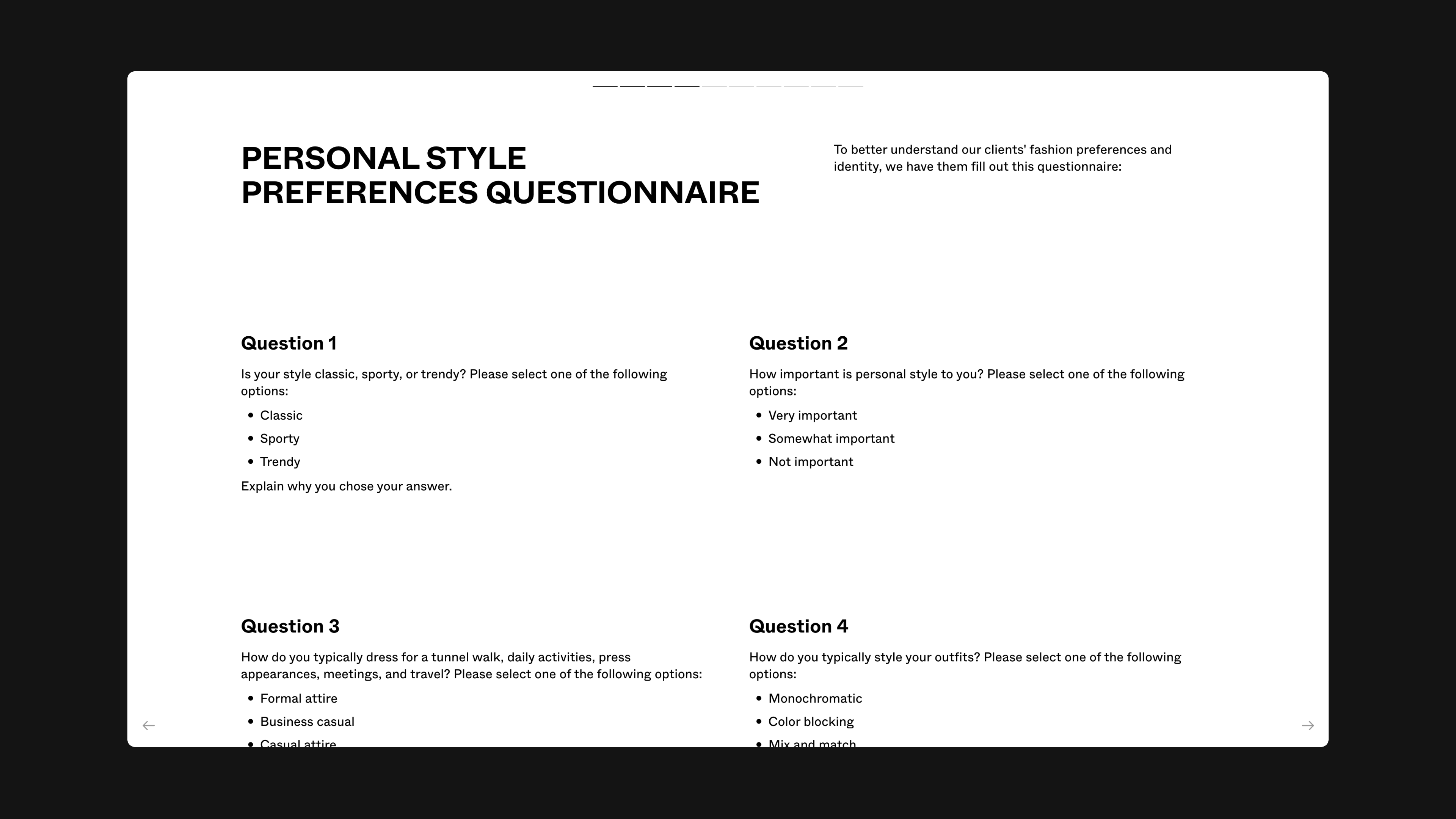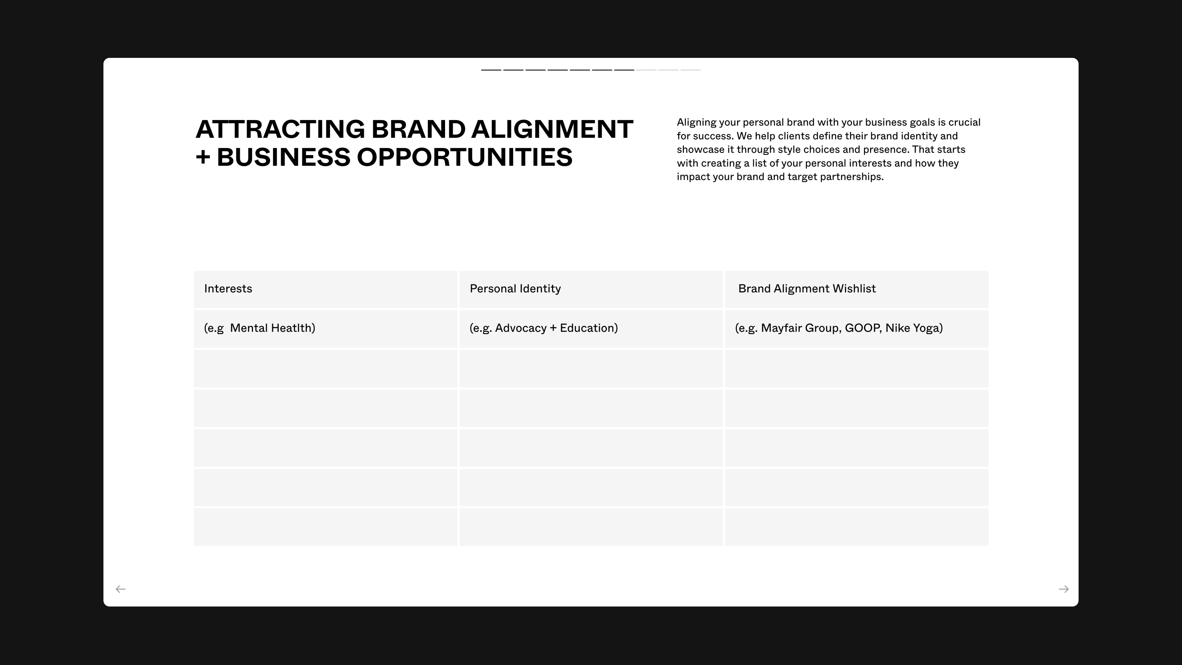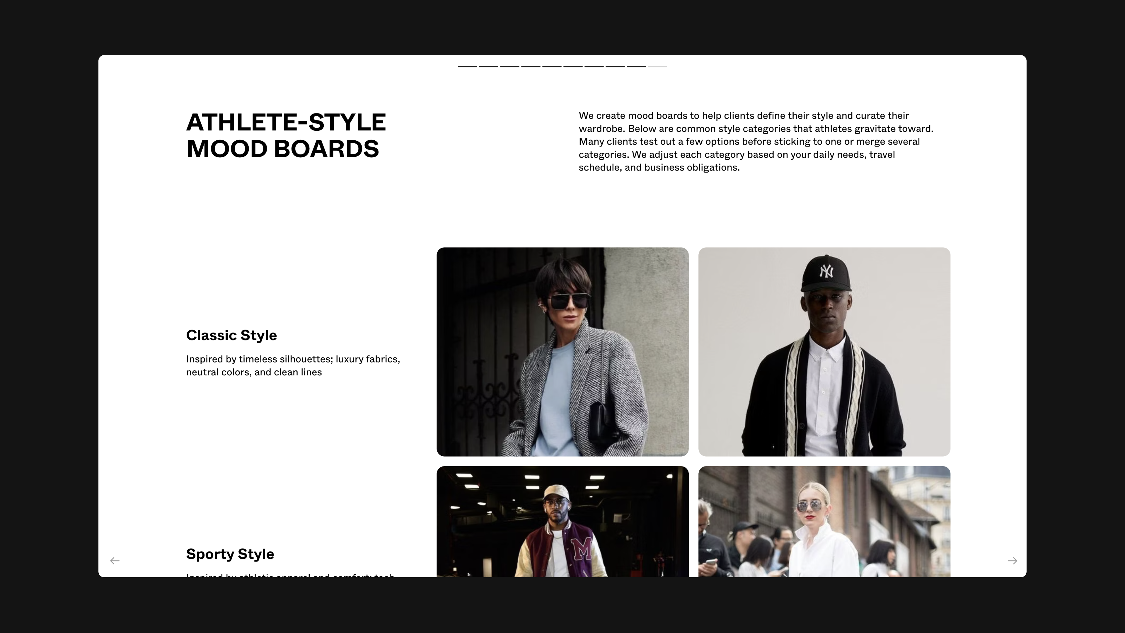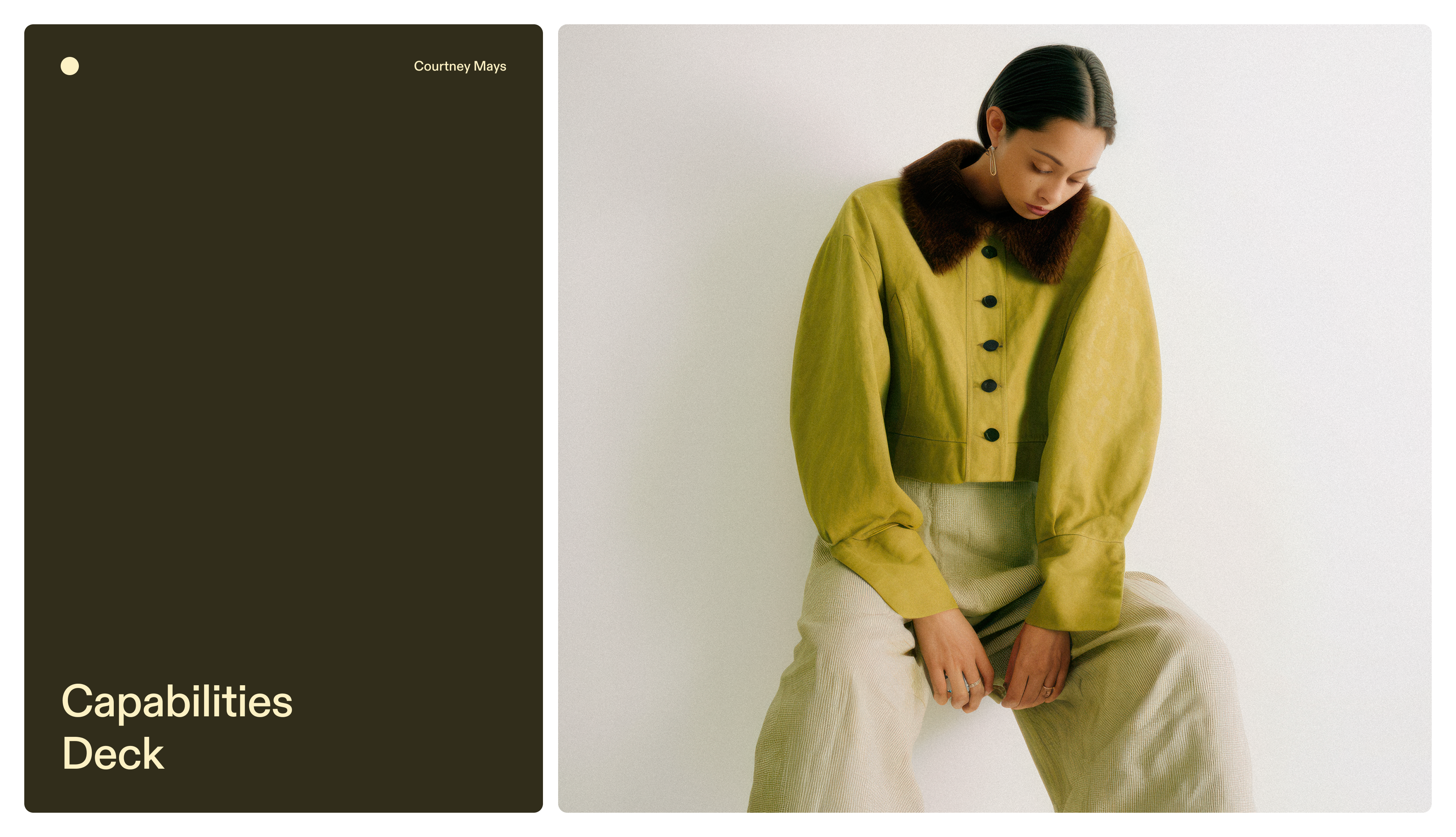 Courtney Mays, founder and principal stylist at The Parker Mays Collective, helps clients—mainly athletes—define their personal style and amplify their impact. She uses a capabilities deck to convey her unique approach. “It’s important that consumers know exactly what services you’re providing,” she said. “I want to support people using fashion as a platform, not help them get that sneaker that five people have.”