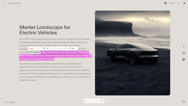 Hit ⌘K (or Ctrl-K on Windows) and prompt Tome to add a page with the new content. You can still add, edit, delete, or rearrange content in your tome, just like you’re used to.
