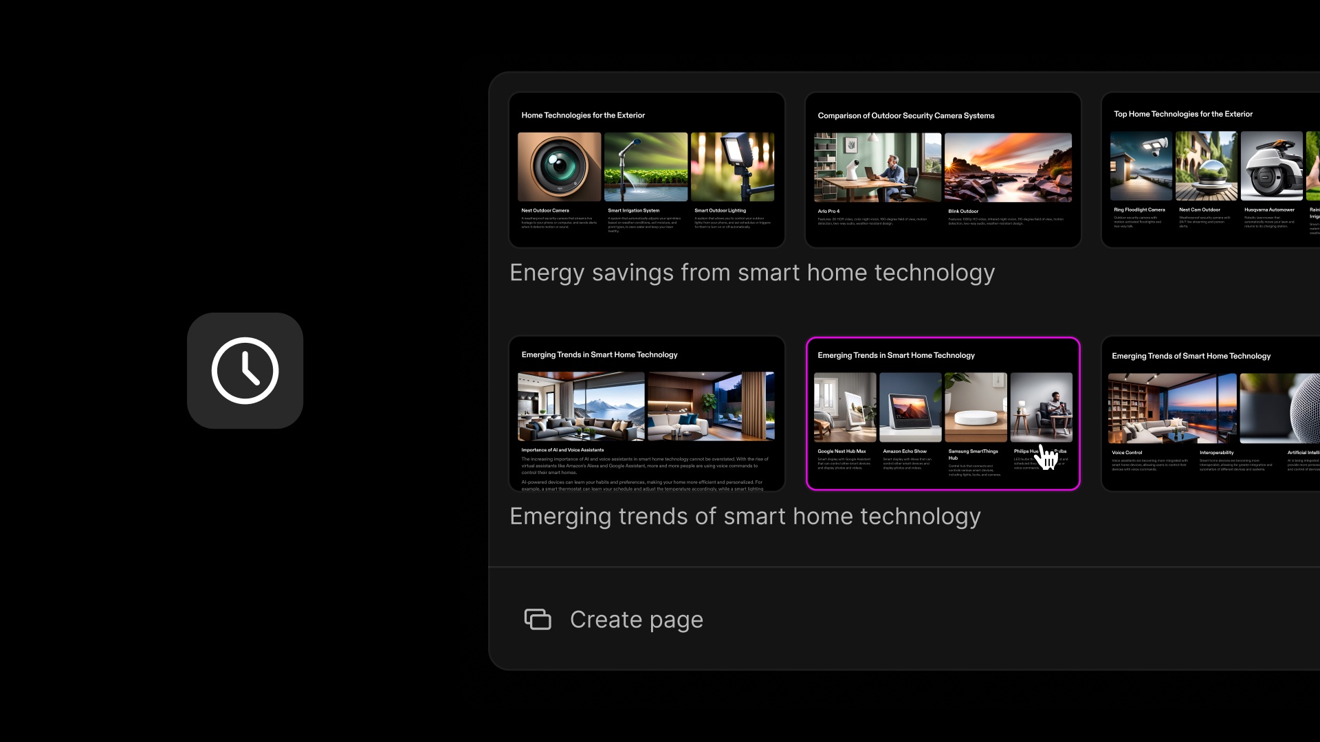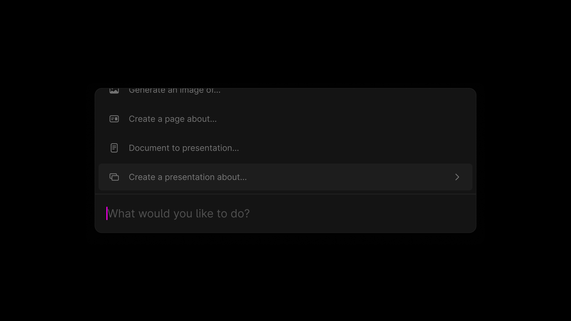 - When you create with the prompt bar, you can now select an output type (presentation, story, or outline) and image style (auto, cyberpunk, neo-impressionist, anime, pop art, fantasy, or no images).