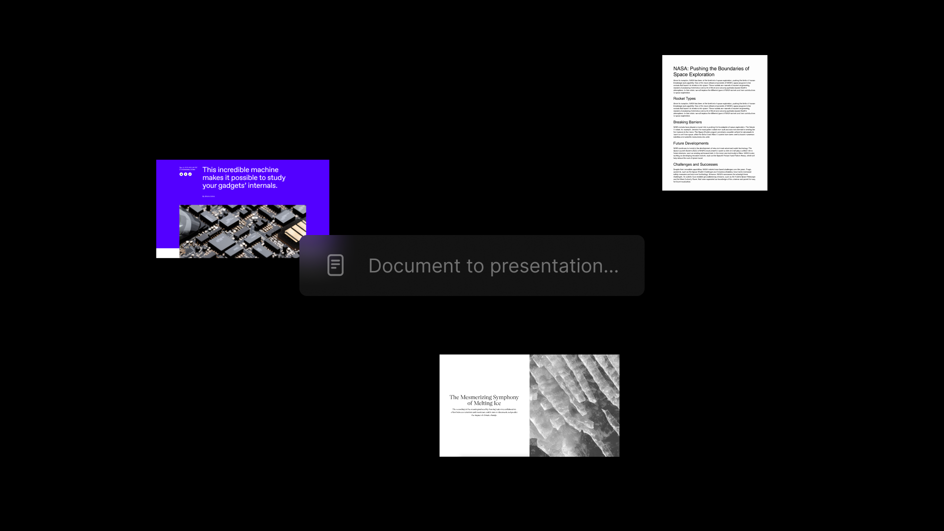 Use Tome to analyze and convert interview transcripts, research papers, news articles, manifestos, and even historical speeches into easily digestible presentations, with the most important points intelligently summarized for you.
