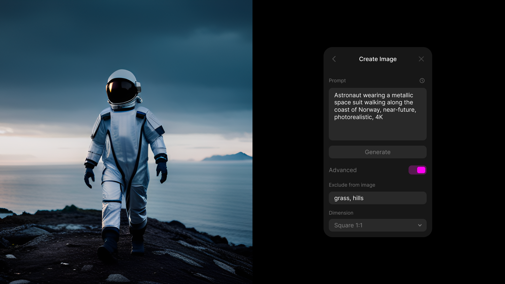 To get started, open the tile picker, click and drag a DALL·E 2 tile onto your page, type in a prompt, and click generate. You'll be able to select from 4 generated images or you can edit the prompt and regenerate the images.