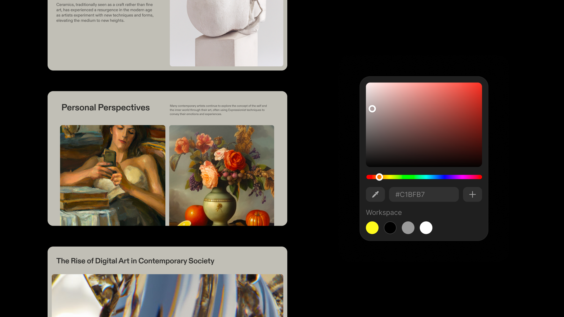 - Have certain colors in mind? Use the eye dropper to select the color values from an existing asset— like a brand book—or simply type in the Hex values.