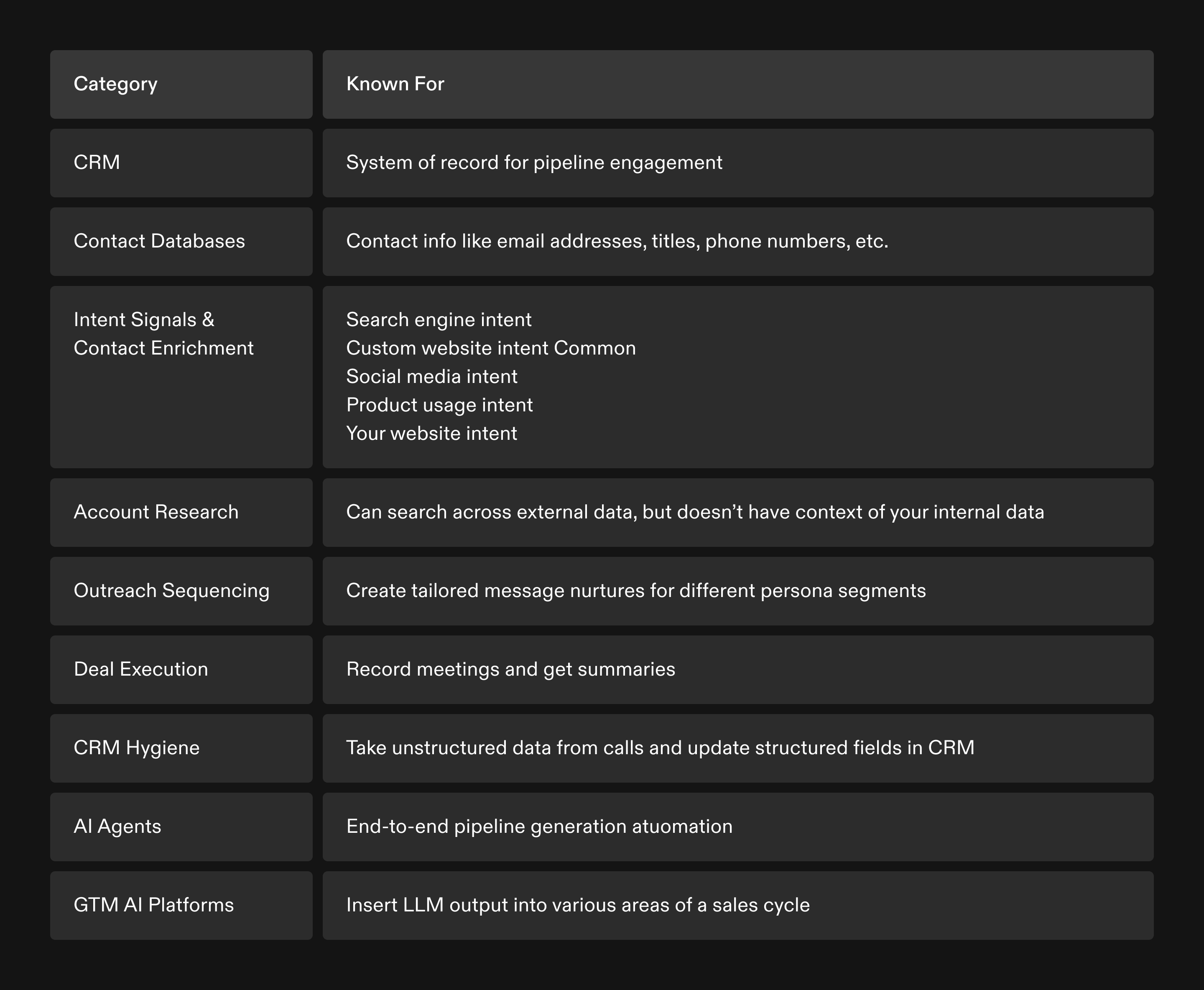 While “Contact Databases” and “Intent Signals & Contact Enrichment” tools help with building extremely detailed lists of accounts and prospects to go after with signals on which ones to prioritize, those signals just tell them when to reach out and how to reach out.