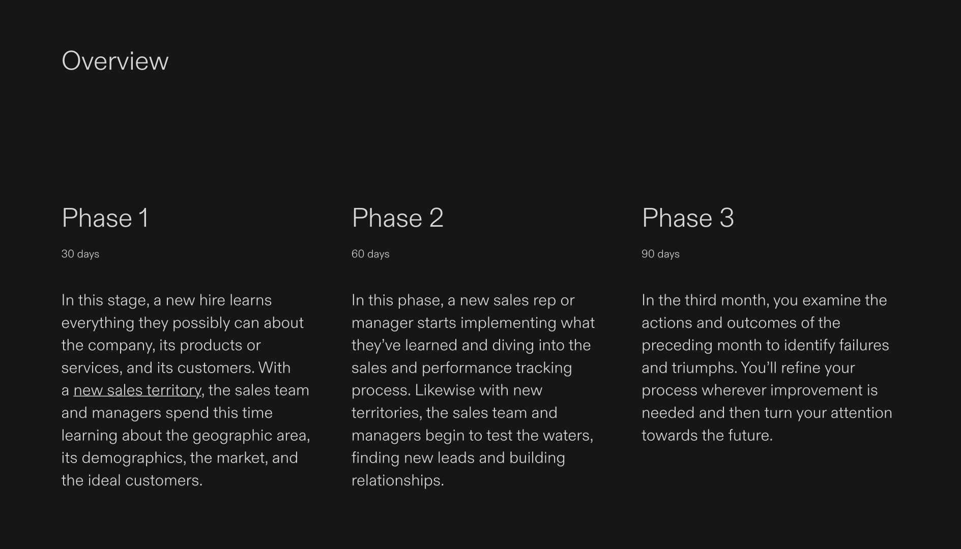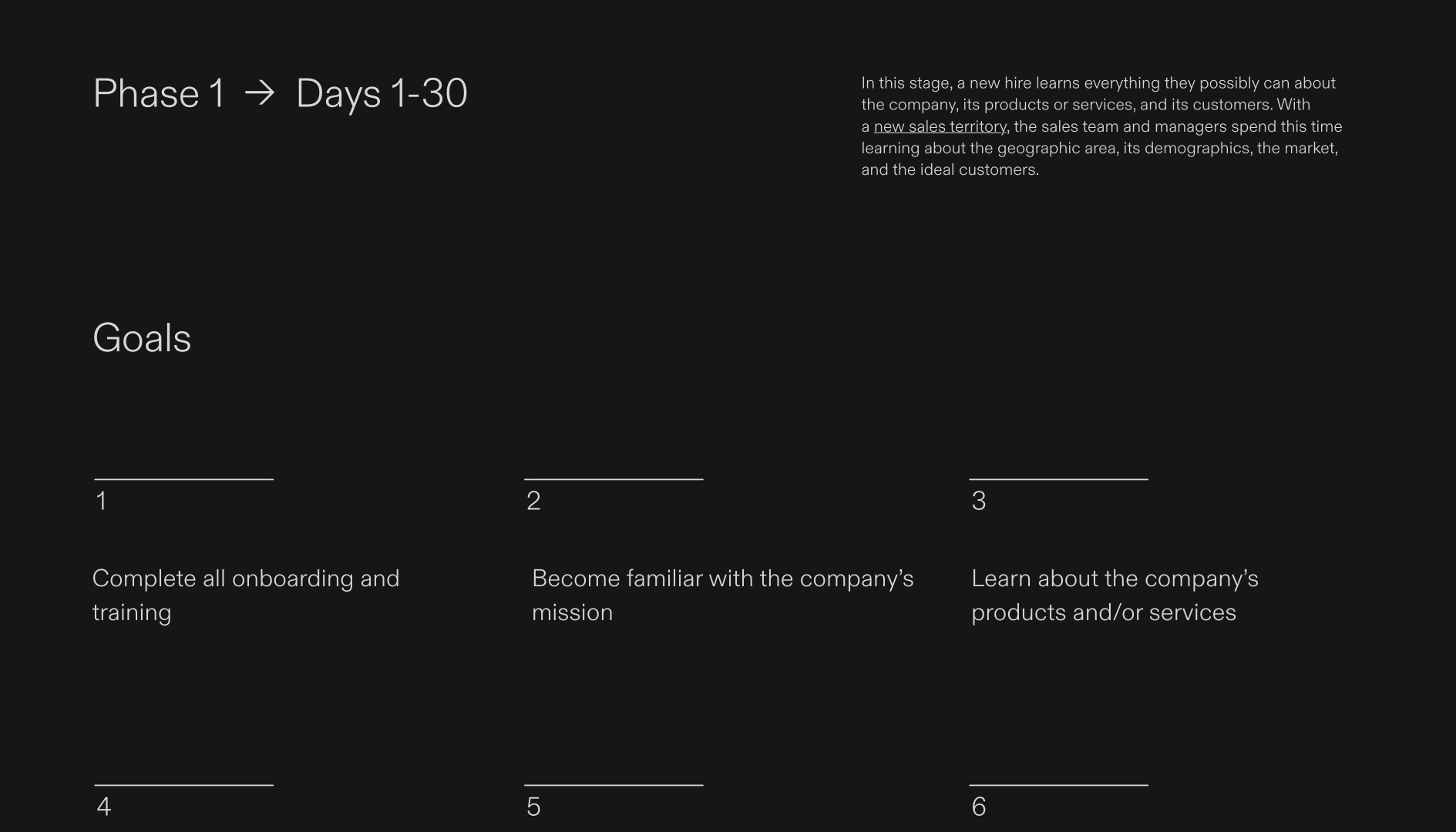 Onboard new hires and set them up for success with this helpful template. Featuring introductory slides and one-pages for 30, 60, and 90 days respectively, you’ll have ample space to lay out the goals for each phase. Each phase one-page has a clear breakdown of the goals and an editable tracker chart that will make it easy to track progress. This template is perfect for sales teams, big or small. All fonts, colors, and images are editable.
