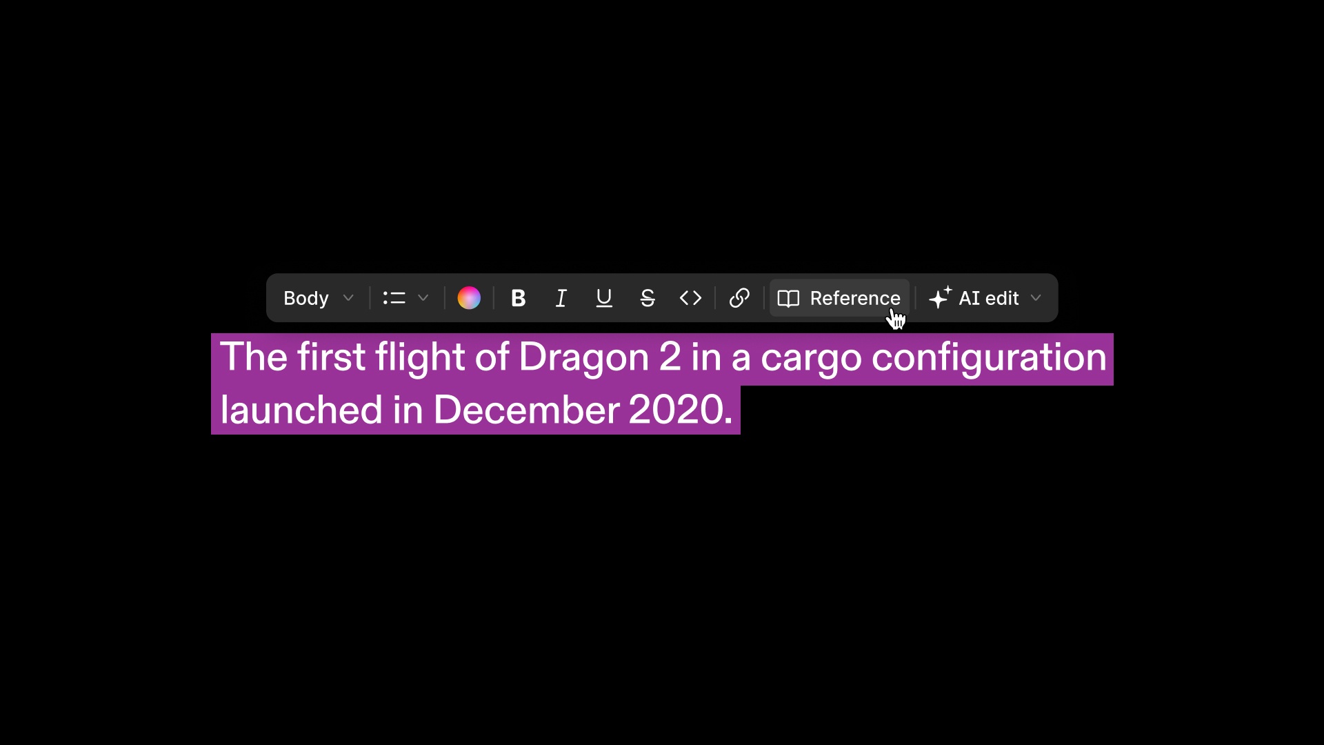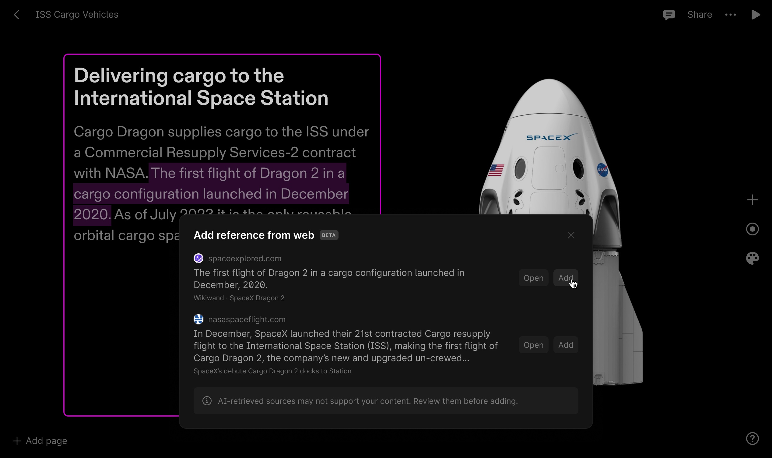 Notice in our example below how two references have appeared in the hover state module. The first reference listed aligns with your highlighted statement: The first flight of Dragon 2 in a cargo configuration launched in December 2020.
