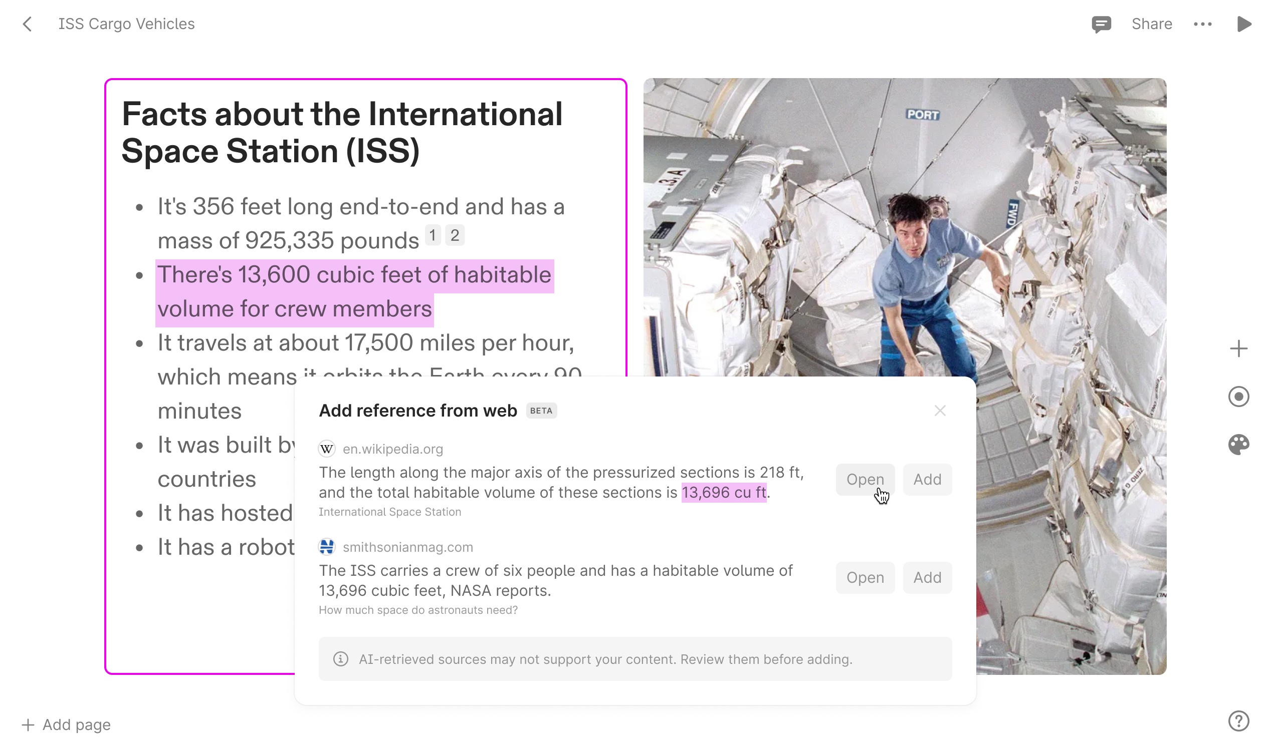 The first reference includes information that doesn’t align with your selected statement—habitable volume for crew members is actually 13,696 cubic feet. Here, the feature shows you a different, relevant source to consider—one that's even more precise. The opportunity to change how you express your statement is now possible.