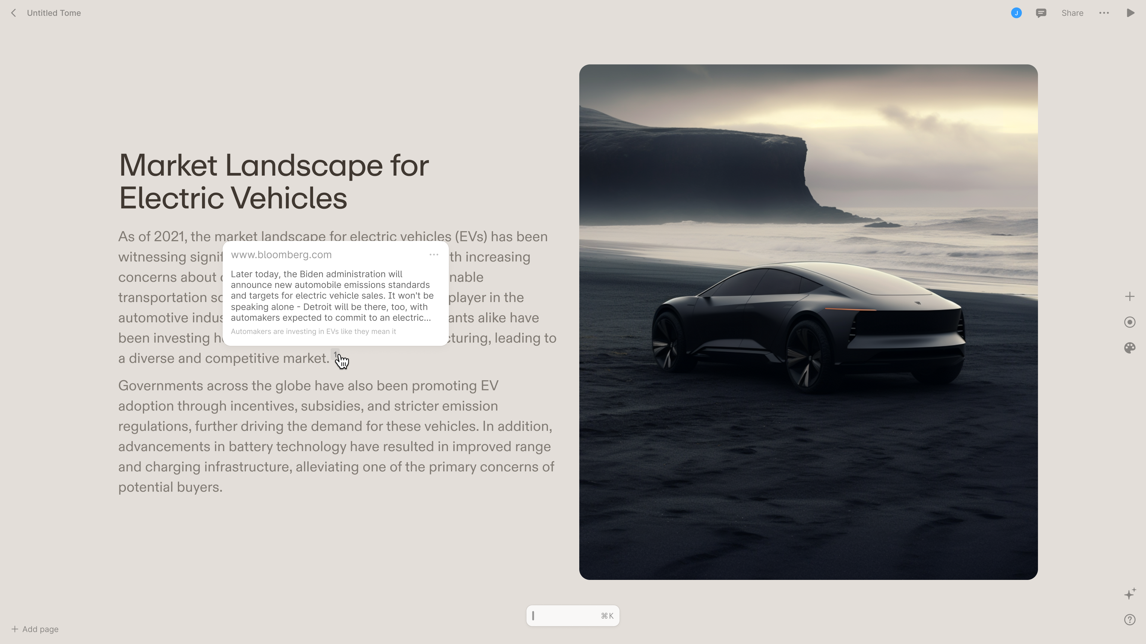 Tome’s AI searches every page of the internet, curating only the most relevant, high quality references for you to review. Tome then bubbles up a key, concise excerpt from each source in the hover state where you can review the strongest validating piece of information right away. If it works for you, add the reference to your work, or keep exploring information by opening other sources.